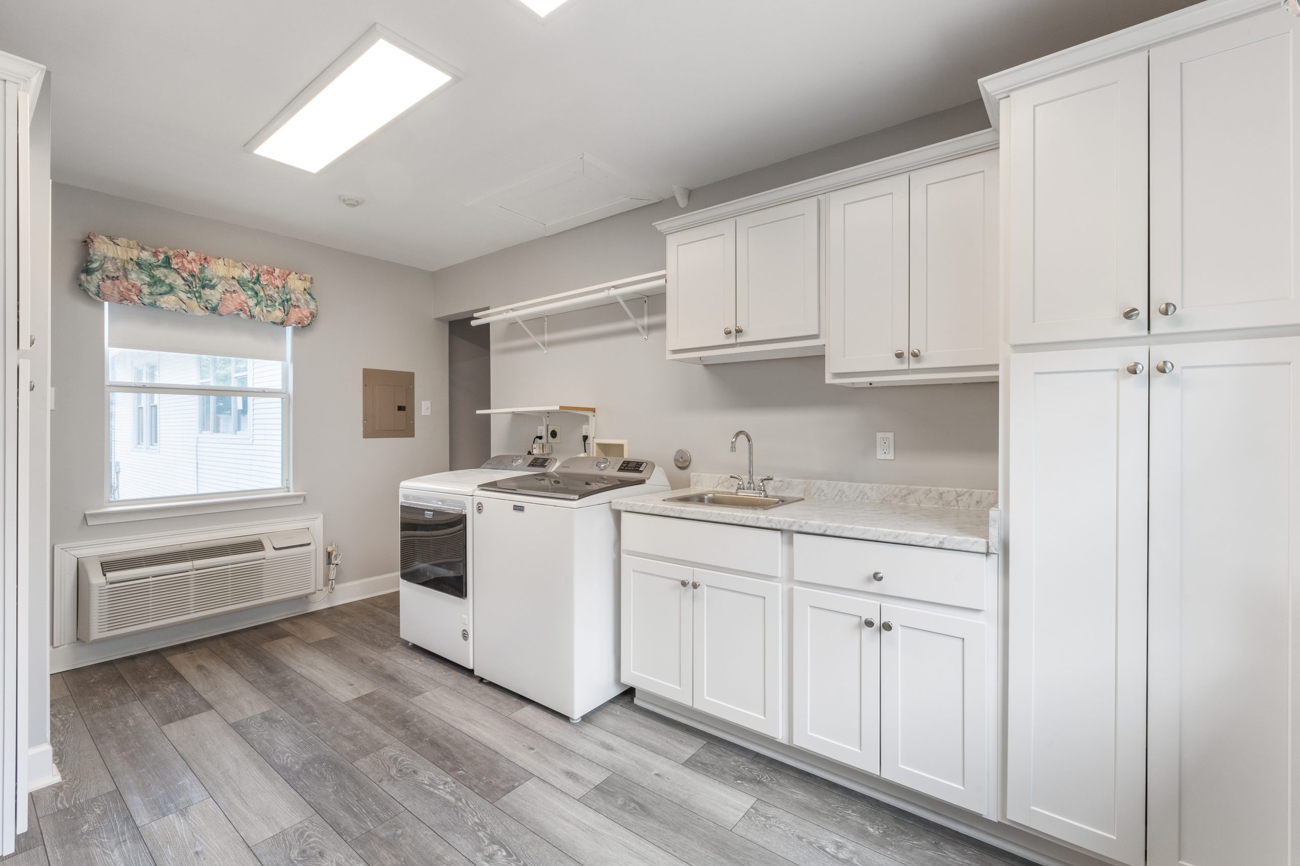 The kitchen is equipped with stainless appliances and ample room for cooking and gathering. An extra-large dedicated laundry room includes a full-size washer and dryer, along with cabinet storage.