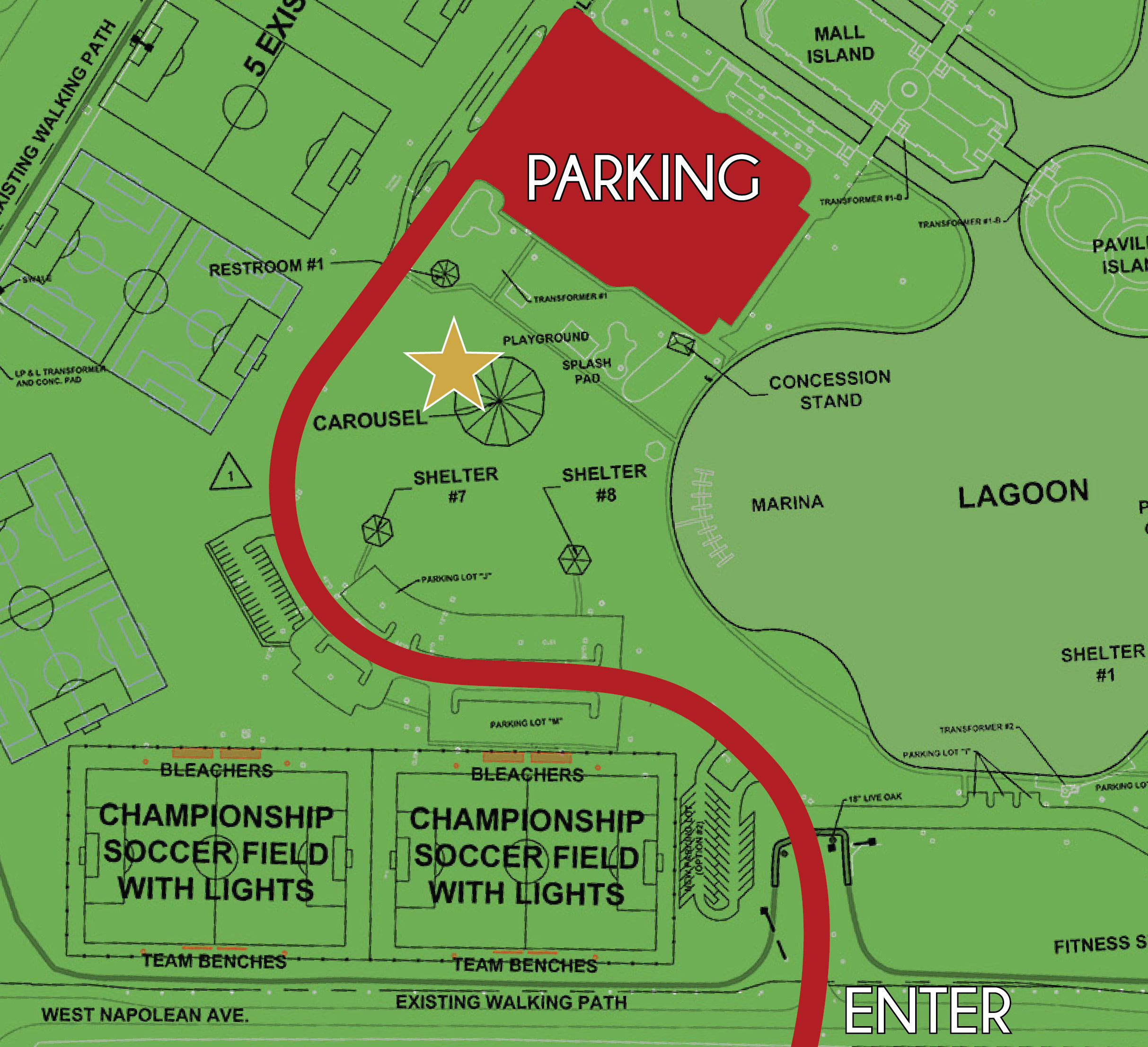 Enter through the gates at West Napoleon & show your parking pass, you will then be directed to turn left where you will be guided to the parking lot located on Downs Blvd, near the carousel. Parking will not be guaranteed after 5:30pm. You will be given a parking pass prior to the event. If you have questions, please email BrendaH@1st-lake.com. YOU MUST HAVE YOUR PARKING PASS IN ORDER TO ENTER THE PARK.