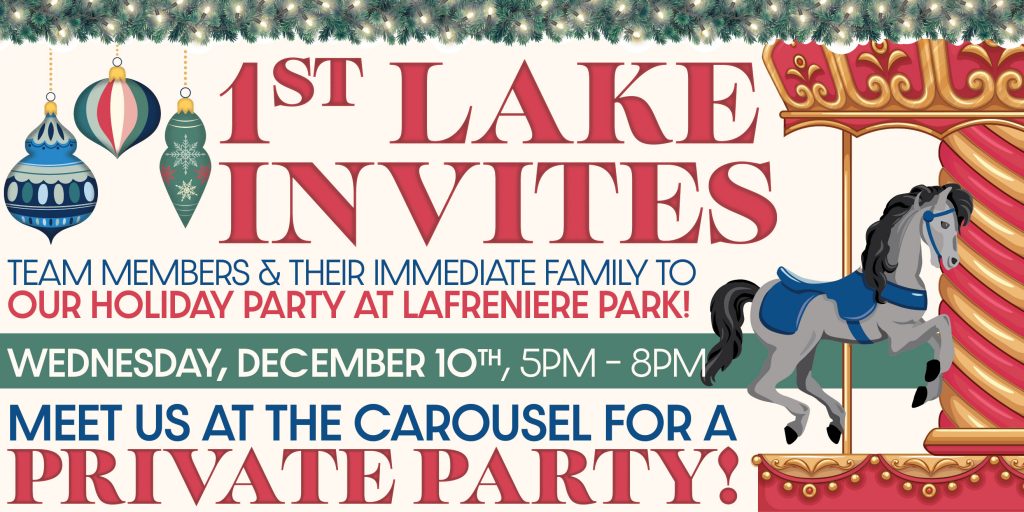 Each team member will be given a parking pass for one vehicle to enter prior to the event. RSVP below in order to receive a parking pass. Check-in at the carousel, where 1st Lake will host a private party for 1st Lake team members & their immediate family members. Wristbands will be provided when you check in. Guests will be treated to hot chocolate, coffee, food, drinks, and dessert, take a ride on the carousel, take pictures at the photo station, and visit the festive light display at Lafreniere’s Christmas in the Park. The light tour is visible by walking around the park.